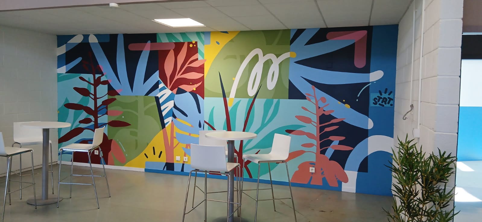 L’objectif de ce projet était clair : égayer, dynamiser et valoriser les lieux de vie étudiante, en y intégrant des créations originales capables d’apporter identité, couleurs et convivialité.
